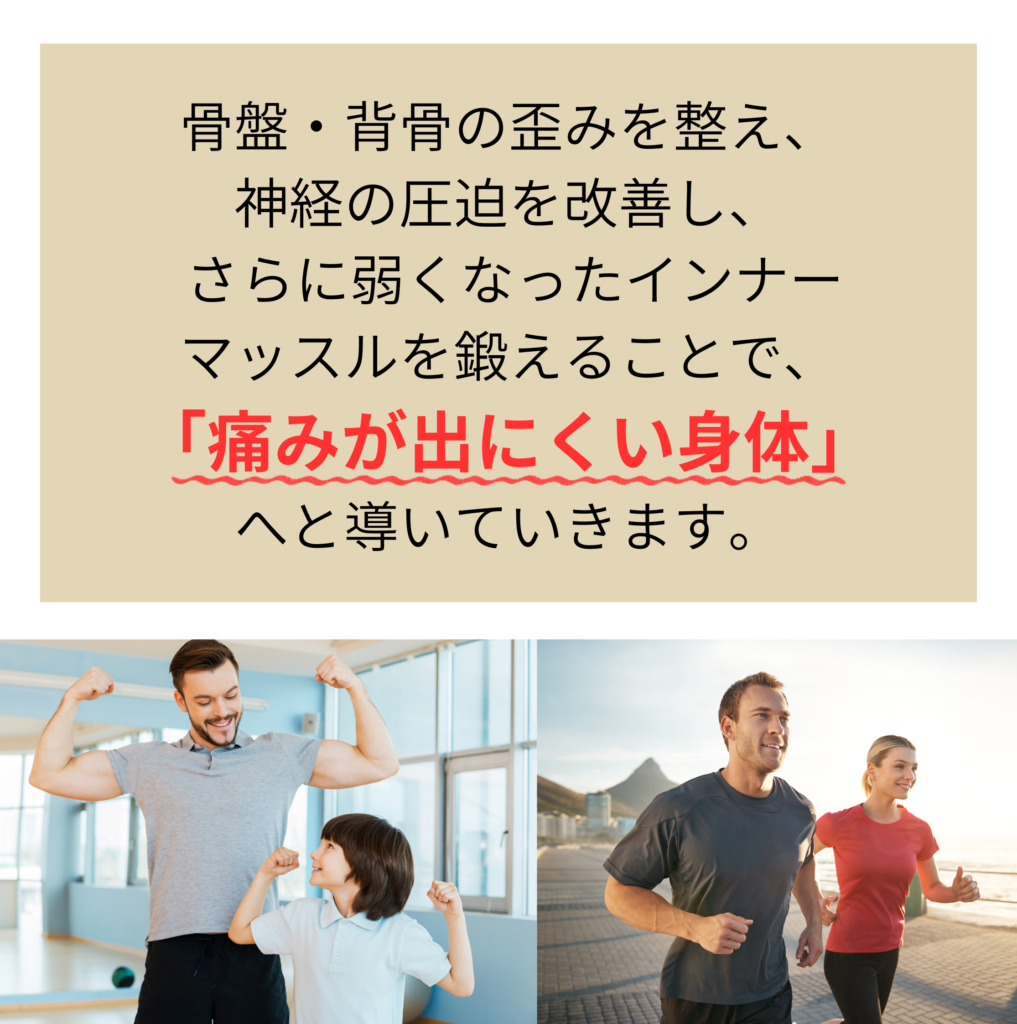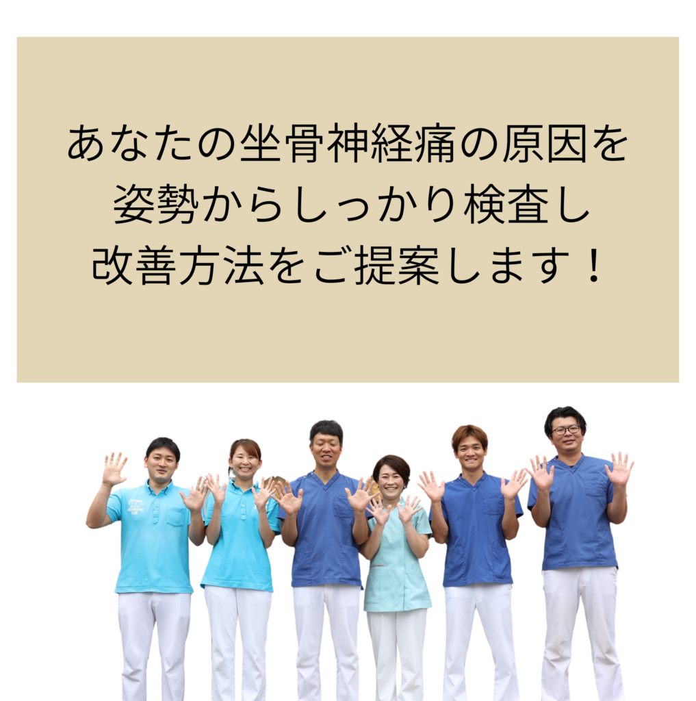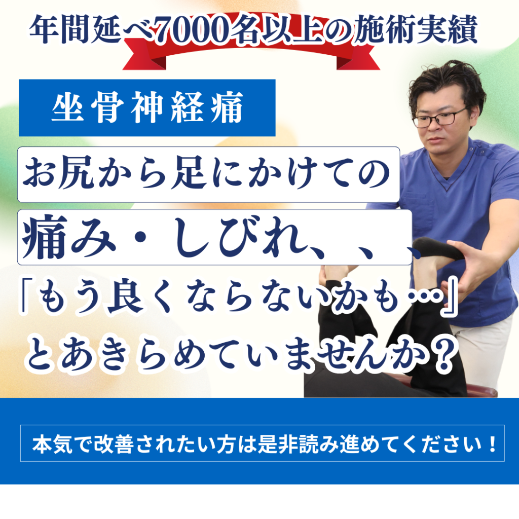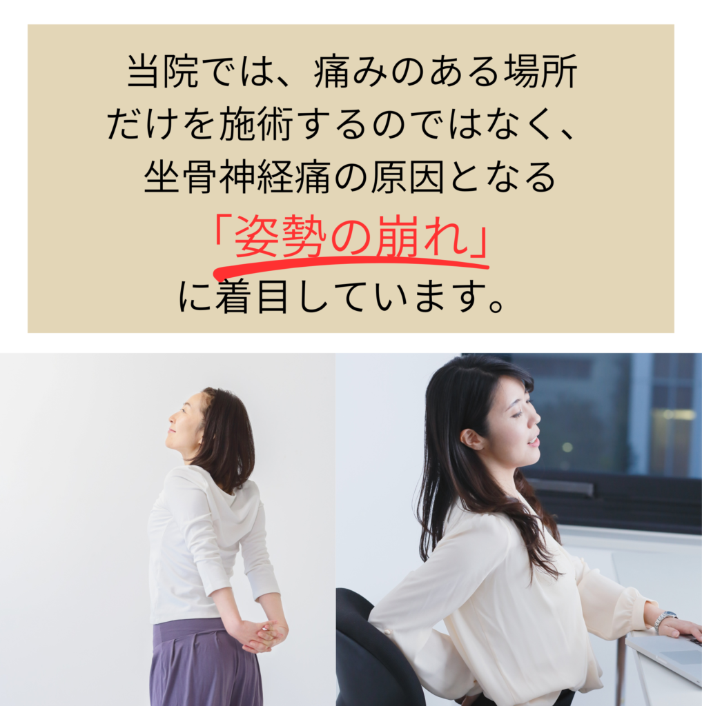 - 坐骨神経痛が繰り返す大きな原因は、姿勢の崩れやインナーマッスルの弱さなど「体を支える力」が低下していることにあります。 当院では痛みを和らげる施術だけでなく、骨盤や背骨のバランスを整えながら、インナーマッスルを強化するトレーニングや自宅でできるセルフケアもお伝えしています。 そのため、症状を改善するだけでなく「再発しにくい身体づくり」を目指したサポートを行っています。