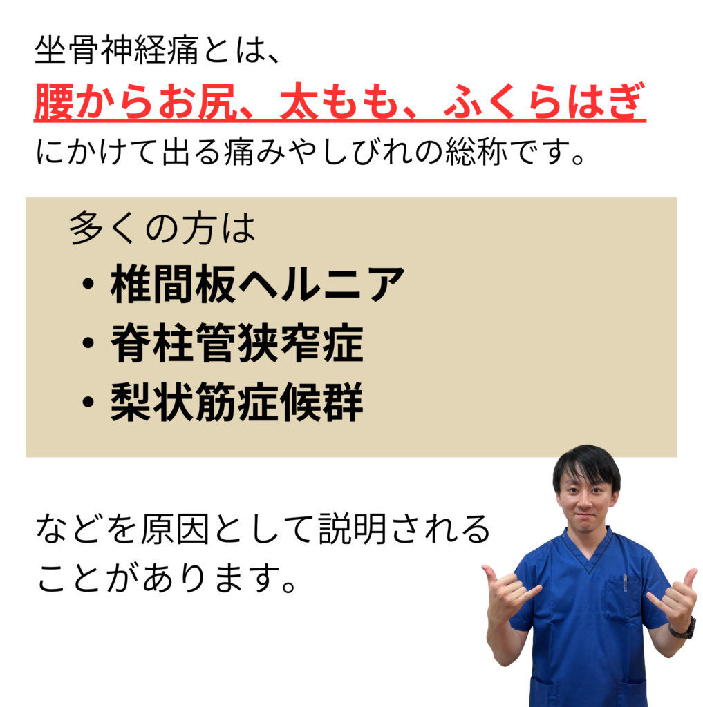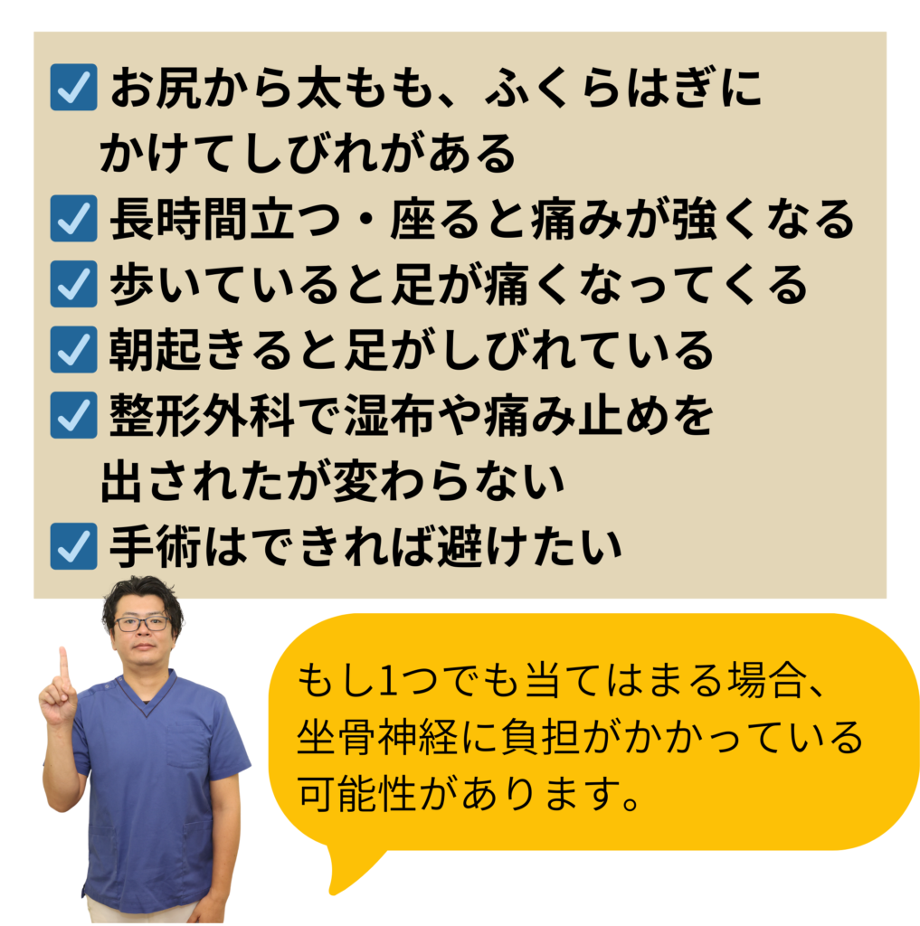 - はい、可能性はあります。 坐骨神経痛は、レントゲンやMRIで見える骨の問題だけでなく、骨盤のゆがみ・筋肉の緊張・姿勢の崩れなどが重なって神経に負担がかかっているケースが多くあります。 当院では、骨盤や背骨のバランス、筋肉の状態、姿勢のクセなどを総合的に確認し、神経に負担がかかっている原因から整えていきます。 そのため、病院で診断を受けた方でも症状が改善していくケースは多くあります。 ※症状や状態によっては医療機関との併用をおすすめする場合もあります。